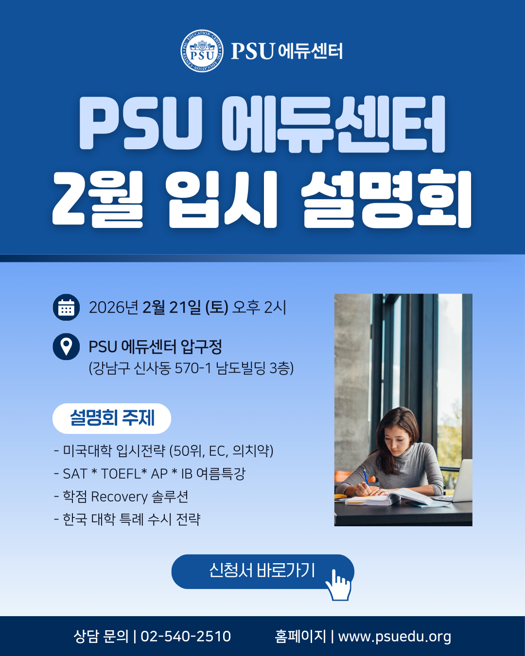 * 설명회 참석을 원하시는 분은 PSU에듀센터로 연락하여 예약해 주시기 바랍니다.